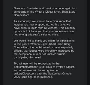 I am sad to say that my cute short, short story that I submitted did not get chosen. This was the first time I paid that much for a contest and had a story under 1,000 words. I was very proud of myself. Mom and Aunt Bonnie both laughed out loud with the ending, which I consider a major win, as that was the point of it. Maybe next year.
